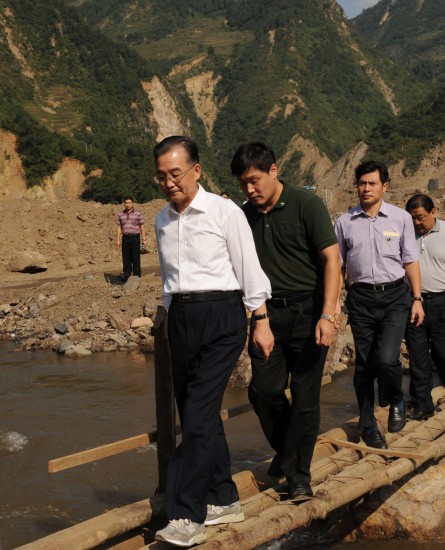 这是9月24日,温家宝在青川县红光乡东河口村踏着由几根枯树杆绑成的独木桥过河看望对岸的村民。新华社记者黄敬文摄