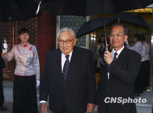 会见结束后温家宝雨中撑伞送基辛格。中新社发盛佳鹏 摄