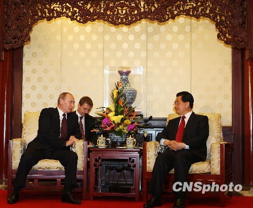 10月14日,国家主席胡锦涛在北京钓鱼台国宾馆会见俄罗斯总理普京。 新华社记者刘建生摄
