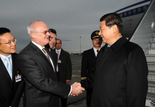 罗马尼亚外交部国务秘书科斯泰亚到机场迎接习近平副主席。新华社记者饶爱民摄