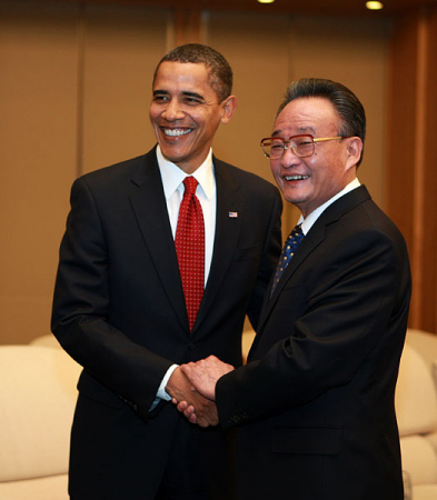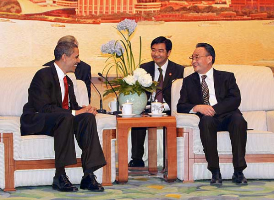 吴邦国委员长与奥巴马总统的会面是在人民大会堂上海厅进行的,会面的气氛十分轻松愉快。吴邦国委员长对于奥巴马总统这次能够有机会到上海访问感到很高兴,因为他说他自己曾经在上海工作过三十年。而且吴委员长还告诉奥巴马,中国有一种说法是,要了解近代中国一百年的历史应该去上海看看,要了解中国近1000多年的历史就得来北京,那么要了解中国2000年的文明史就要去西安看一看了。因此,他建议奥巴马总统下次访问中国的时候能够有机会去西安访问。吴邦国委员长还愉快地回忆起他9月份对美国的访问,并说当时他同奥巴马总统的会晤给他留下了深刻的印象。