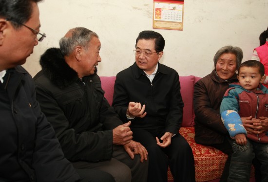 胡锦涛来到汉中市宁强县汉源镇亢家洞村五里坡安置点王志忠家看望,详细了解地震灾后群众住房重建和生产生活恢复情况。新华社记者鞠鹏 摄